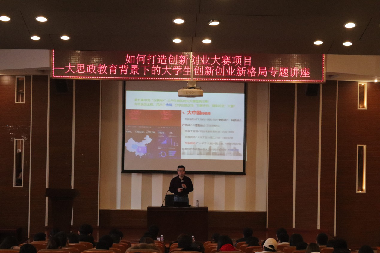 12月19日,創(chuàng)業(yè)指導(dǎo)中心在理工館學(xué)術(shù)報告廳舉辦了關(guān)于“如何打造創(chuàng)新創(chuàng)業(yè)大賽項目——大思政教育背景下的大學(xué)生創(chuàng)新創(chuàng)業(yè)新格局”專題講座,特邀請到在全國重點高校、北京市政府單位和國有金融投資企業(yè)擔(dān)任管理職務(wù),長期從事文化金融領(lǐng)域的孵化與創(chuàng)投工作,現(xiàn)任中視澤宜投資創(chuàng)始人的楊波博士進行此次講座。此次講座為進一步深化創(chuàng)新創(chuàng)業(yè)教育,提高學(xué)生創(chuàng)新創(chuàng)業(yè)精神,推動各高校創(chuàng)客青年與創(chuàng)業(yè)導(dǎo)師互動交流。出席本次講座的嘉賓有中視澤宜投資創(chuàng)始人楊波博士、學(xué)院副院長兼黨委副書記葉振楠、創(chuàng)業(yè)指導(dǎo)中心老師以及各院系創(chuàng)業(yè)指導(dǎo)老師。