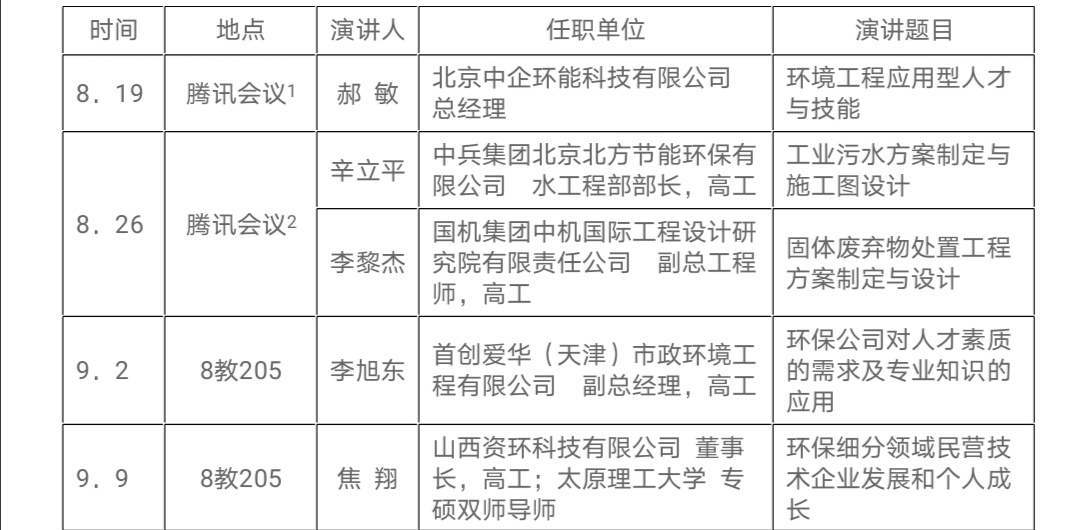 為強(qiáng)化工科應(yīng)用型人才實(shí)踐技能的培養(yǎng),促進(jìn)人才供給側(cè)(學(xué)校)與人才需求側(cè)(企業(yè))的有效溝通,構(gòu)建“教學(xué)與實(shí)踐相結(jié)合”的人才培養(yǎng)模式,城建學(xué)院環(huán)境工程系將舉辦《企業(yè)家進(jìn)課堂》系列講座。此次系列講座將聘請(qǐng)著名央企、國企或民企的企業(yè)家給環(huán)境工程系學(xué)生介紹環(huán)境相關(guān)職業(yè)及對(duì)人才素質(zhì)的需求、企業(yè)發(fā)展對(duì)學(xué)生專業(yè)技能的需求、學(xué)生在職場發(fā)展的要求等;同時(shí)企業(yè)家們將分享他們的職業(yè)生涯經(jīng)歷和人生經(jīng)驗(yàn),以期幫助學(xué)生們盡早走出迷茫,樹立目標(biāo)并進(jìn)行合理的學(xué)業(yè)與職業(yè)規(guī)劃,利用在校的黃金時(shí)期掌握走向社會(huì)所必需的技能。